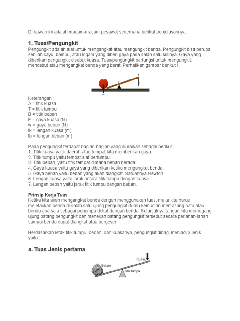 Tuas dapat dibedakan menjadi 3 jenis. Peradaban lembah sungai kuning, salah satu peradaban tertua di dunia. Keuntungan mekanis pesawat sederhana pertama yaitu jenis pesawat sederhana yang termasuk dalam tuas atau pengungkit. Keuntungan mekanik (km) sebuah tuas adalah perbandingan antara gaya berat beban dan gaya kuasa atau perbandingan antara lengan kuasa dengan lengan beban, dirumuskan sebagai berikut : Tolong jawab besar keuntungan mekanis bidang miring tersebut adalah 5 kali.